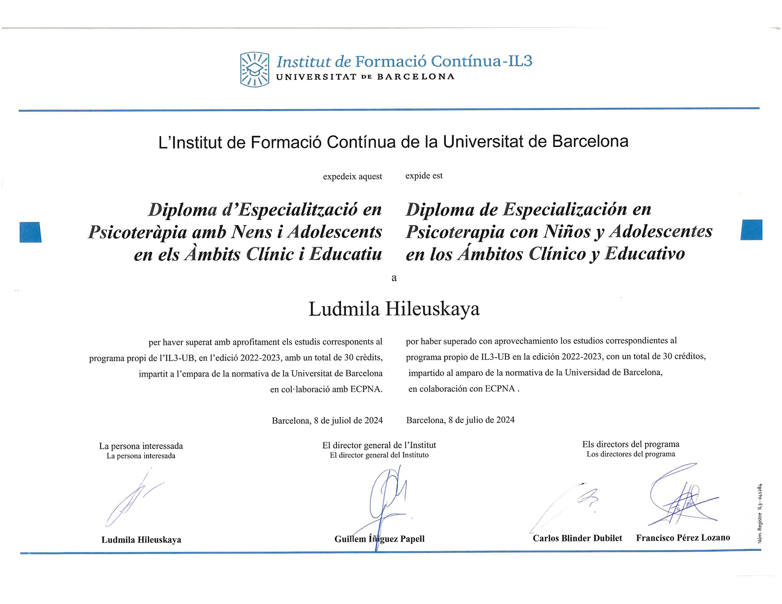 • МГЭИ, специалитет, квалификация «Психолог, преподаватель психологии» (Минск, Беларусь, диплом подтверждён в Испании)