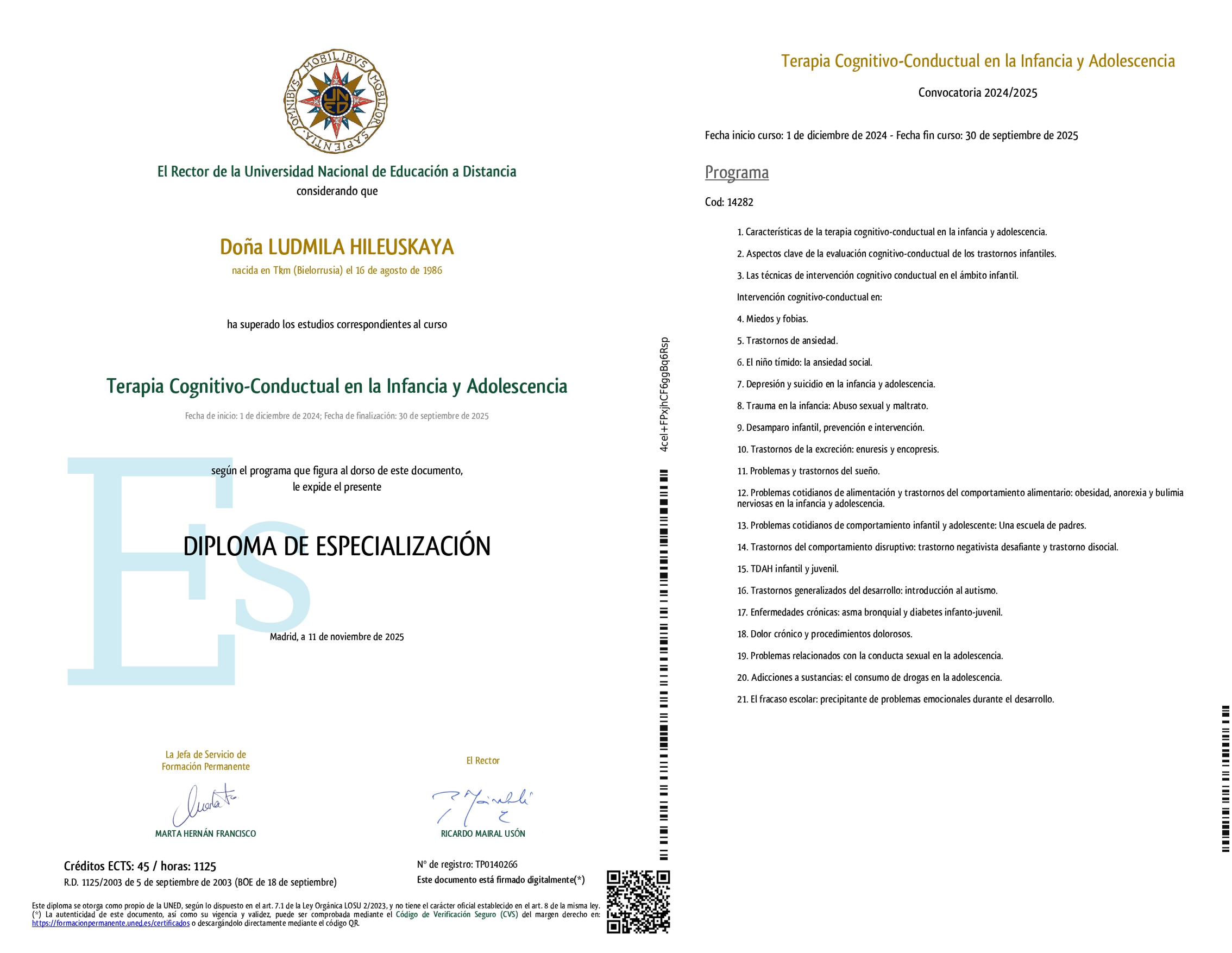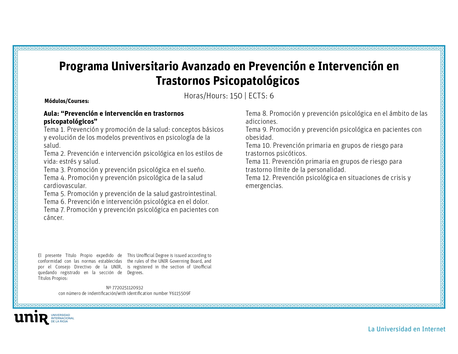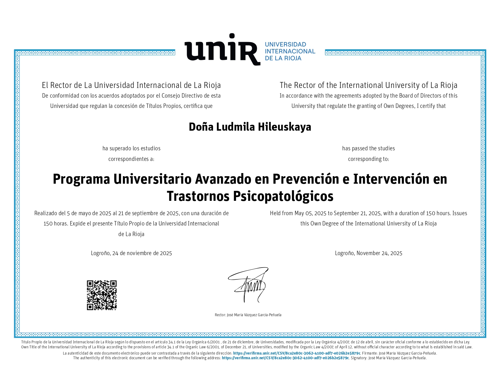 • UNIR Университетский курс по профилактике и помощи при психопатологических расстройствах (Логроньо, Испания);